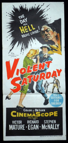 Directed by Richard Fleischer and starring Victor Mature, Lee Marvin, Richard Egan and Stephen McNally. The film, set in a mining town, depicts the planning of a bank robbery as the nexus in the personal lives of several townspeople. Prominent actors Sylvia Sidney and Ernest Borgnine are in supporting roles. Violent Saturday was filmed in color